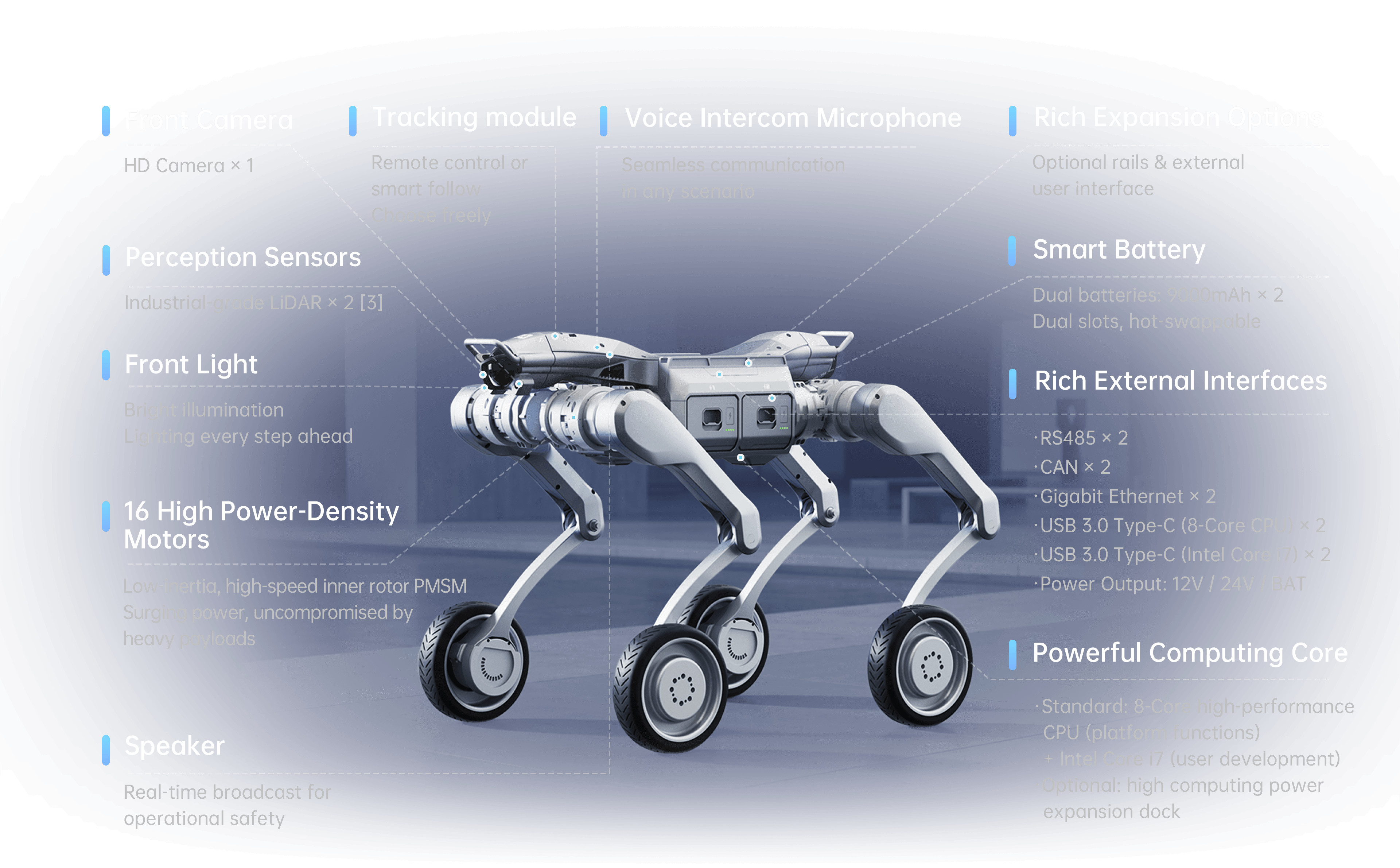 This quadruped robot has a complex structure and powerful dynamics. Users must keep a safe distance from the robot at all times. Please use with caution.