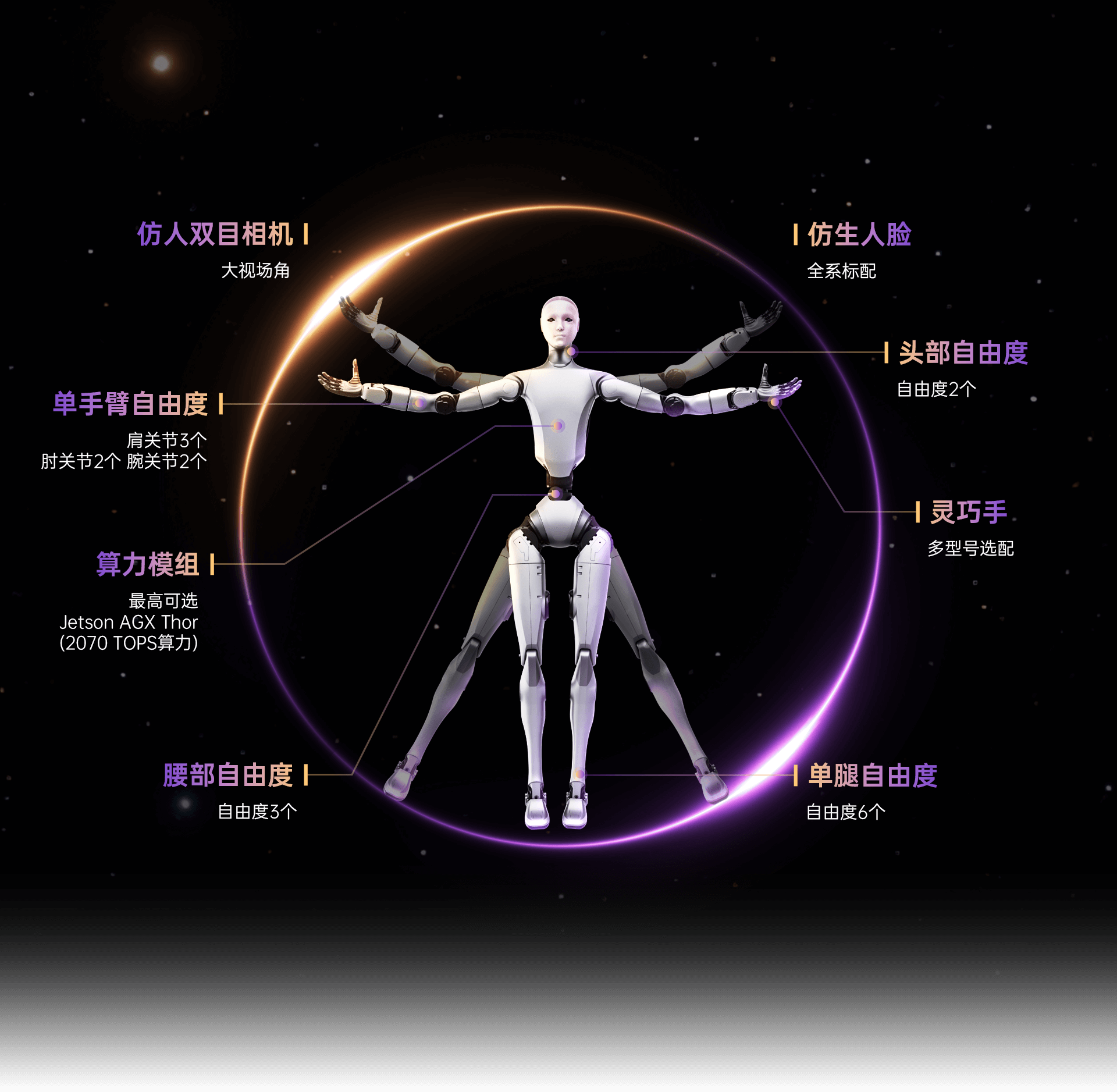 搭载最高2070 TOPS算力芯片,可用于部署各类具身智能大模型,赋能多元工作场景,推动人形机器人持续探索边界。