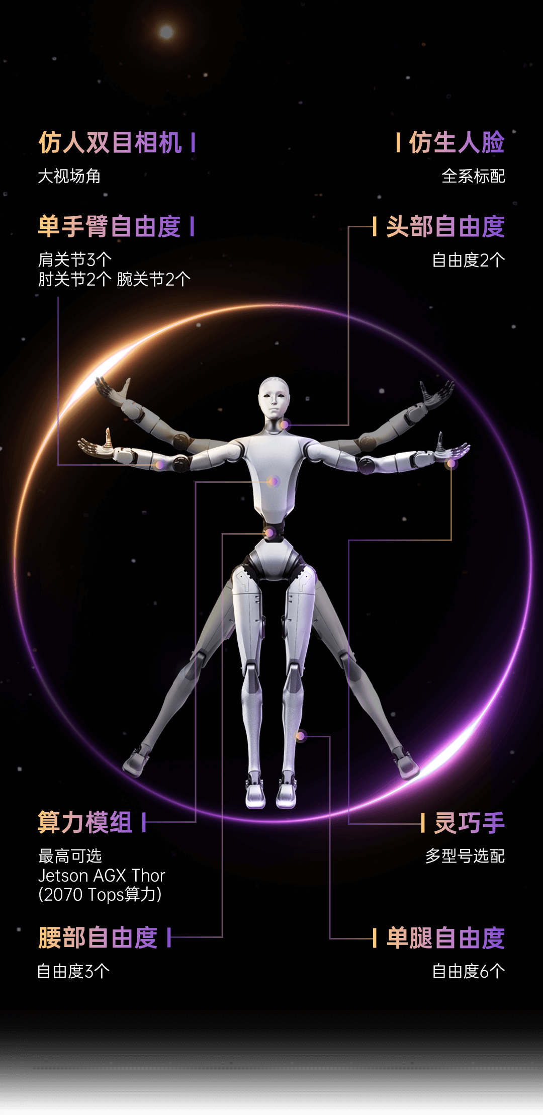 搭载最高2070 Tops算力芯片,可用于部署各类具身智能大模型,赋能多元工作场景,推动人形机器人持续探索边界。