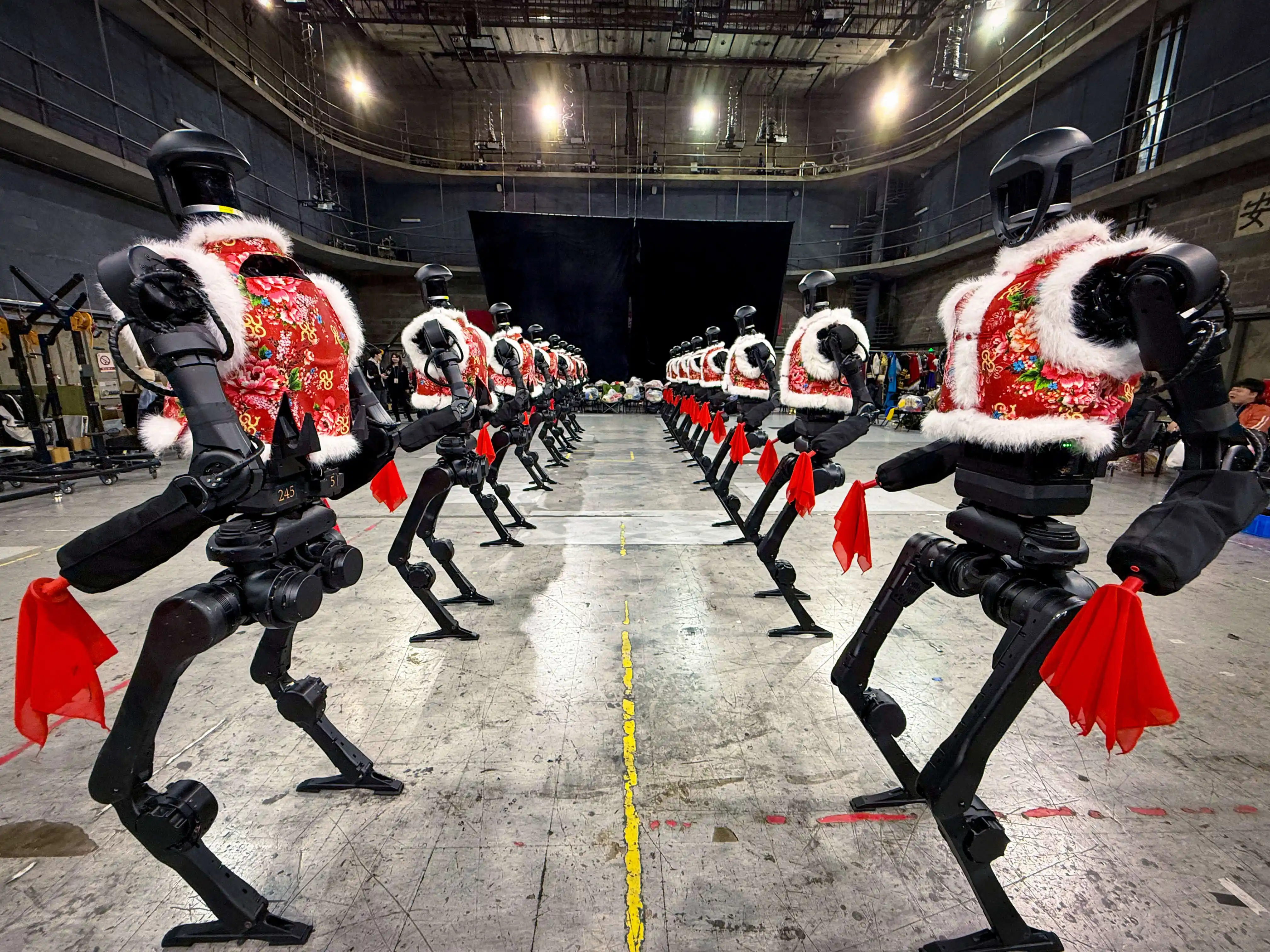 在2025年蛇年春晚中,宇树科技的通用人形机器人H1以“扭秧歌”的形式惊艳亮相,表演了由张艺谋导演的《秧BOT》节目。这些机器人手持红手绢,随着喜庆的音乐节奏扭动身姿,动作整齐划一,场面喜感又魔幻。这是人类历史上首次全AI驱动全自动集群人形机器人的大型全球公开表演,引发了全球范围内的持续热议与广泛关注。